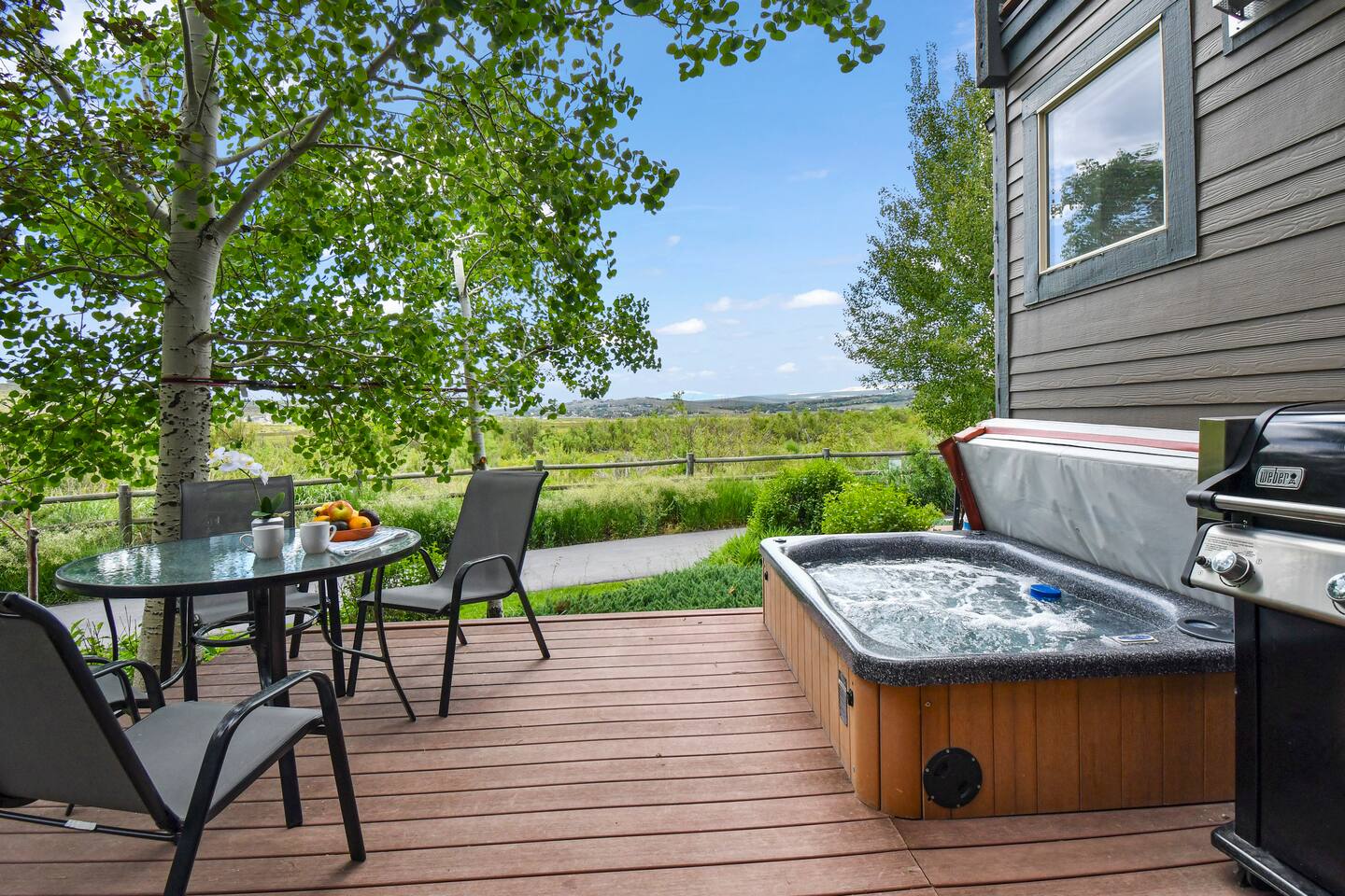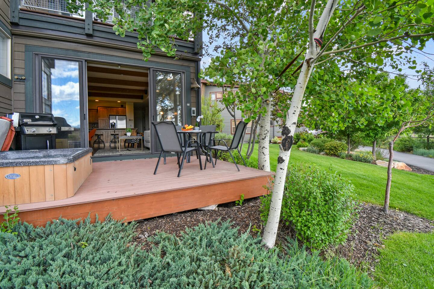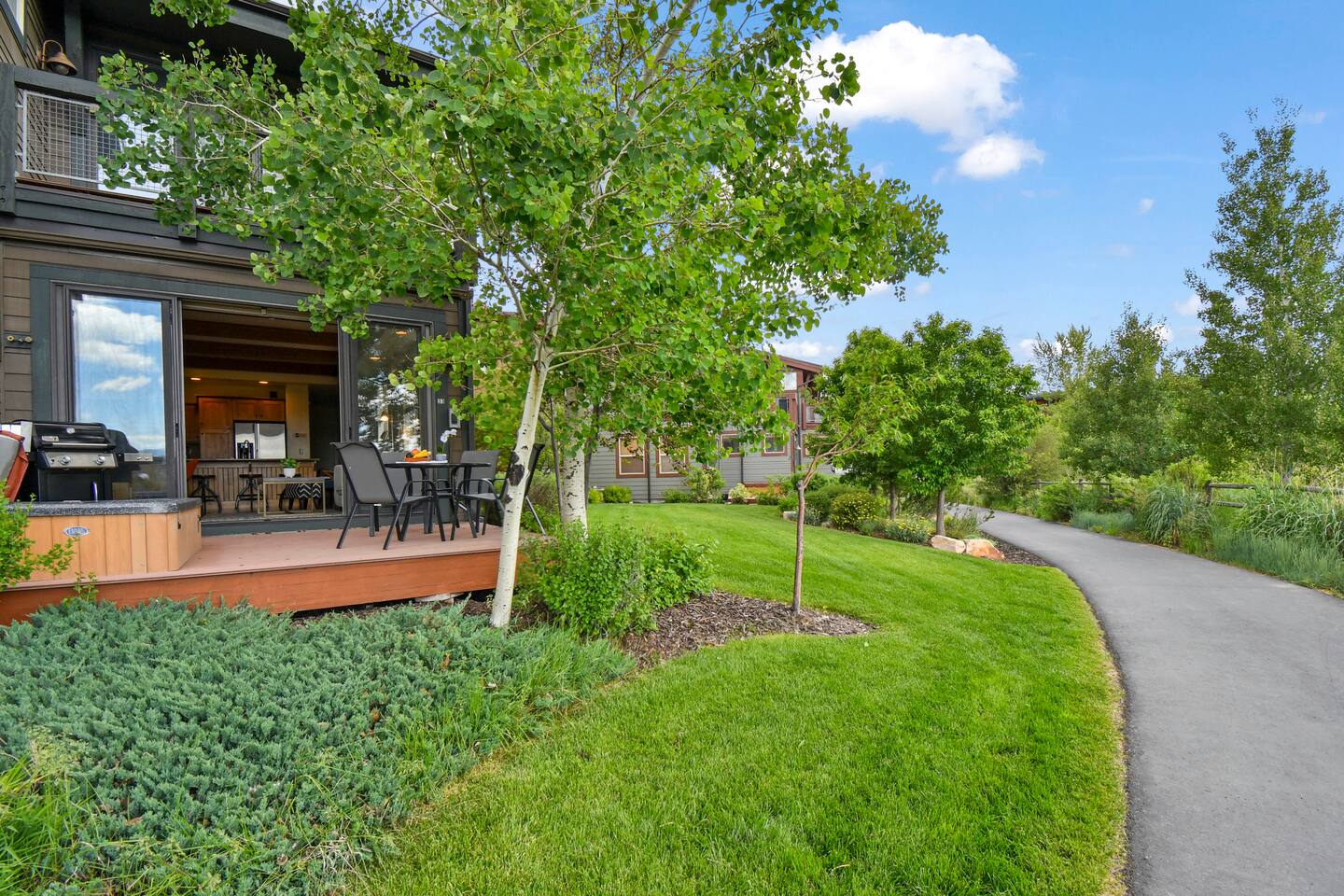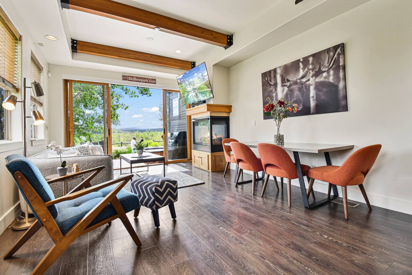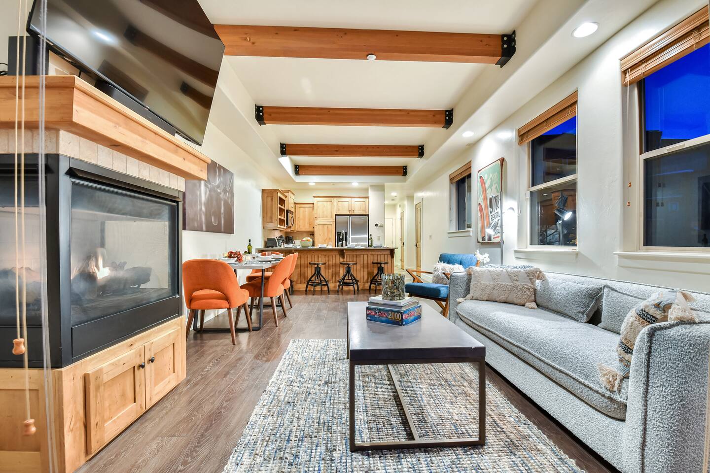 Recently purchased and newly furnished this spacious townhome accommodates 7. If more room is needed a similar size rental unit (#35) is available next door and can be offered at a discount (15%). Amenities include Keyless entry, 65’ & 55’ Smart TVs (2021), Sonos soundbar/speakers, Weber Grill, Hot tub, boot & glove warmer/dryer, broadband internet (200Mb), cable TV (125 channels), and premium streaming services (Showtime, HBO, Netflix, Prime, & Disney) The townhouse also has an attached garage that will fit a full size SUV although no car is needed at this location unless truly desired. It is walking distance to dozens of restaurants, grocery store, and shops within Kimball Junction. It is also a 1 minute walk to the bus stop for the free shuttle to Old Town, Historic Main Street, Utah Olympic Park, and 3 world class skis resorts - Canyons, Park City, and Deer Valley. Download the High Valley Transit app and get free “On Demand” micro-transit inside Kimball Junction and the Canyons Resort. THE LAYOUT You will enter the home from the garage and into the main living area - the living room, dining area, kitchen and first floor bathroom with shower. The bright & open floor plan with floor to ceiling windows overlooking Swaner Nature Preserve! Living Room: This comfortable and cozy space offers a sofa and chair, gas fireplace, 65” Smart TV with Sonos sounder/speakers and a private deck with stunning views and a hot tub. Kitchen: Fully equipped kitchen with all the utensils needed for your homemade meals. There are stainless steel appliances and granite counters, including kitchen bar seating for four. Dining Area: With seating for up to six (w/2 pull up bar stools) Bedrooms/Bathrooms: Master Bedroom (upper level) – King bed, 55” Smart TV with Sonos soundbar and private balcony overlooking Swaner Preserve. There is a full private bath with dual granite counter sinks and a tile shower. Bedroom 2 (upper level) – Queen bed, 55” Smart TV with Sonos soundbar and private deck and private bath with a tub/shower combo. Bunk room (upper level) - Upper level loft with a triple bunk bed. Full size bunk beds are perfect for children, grand-children, and grown adults alike. Hot Tub: Yes, private on main level deck Laundry: Stackable washer/dryer in upper level hall closet A/C: Central I am available to FaceTime to answer any questions in person. This home is in Park City, in Kimball Junction off of I-80.