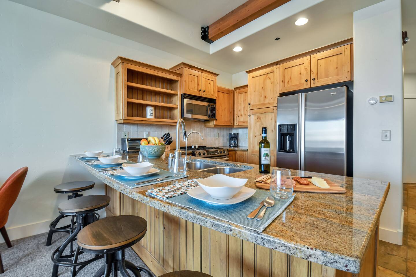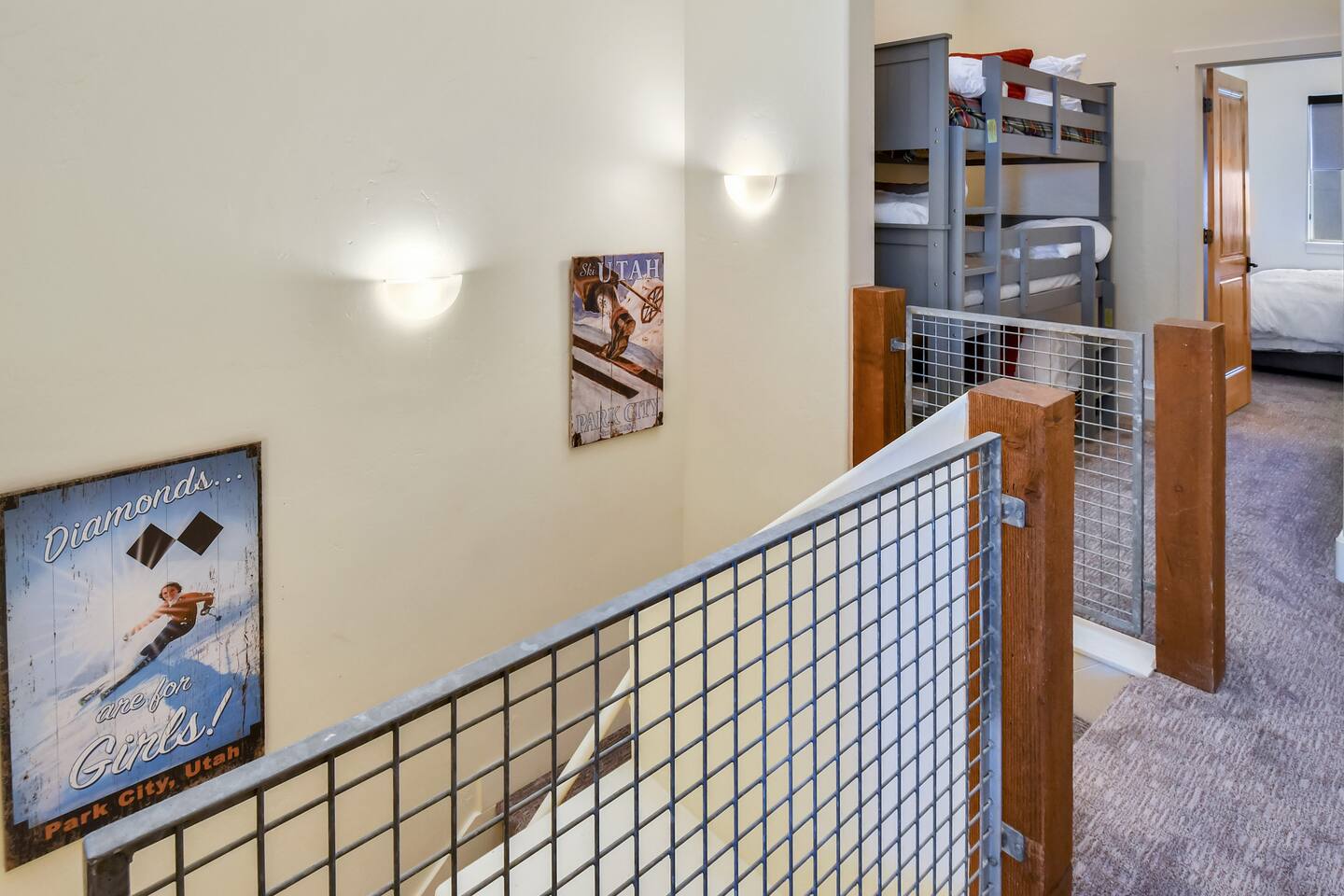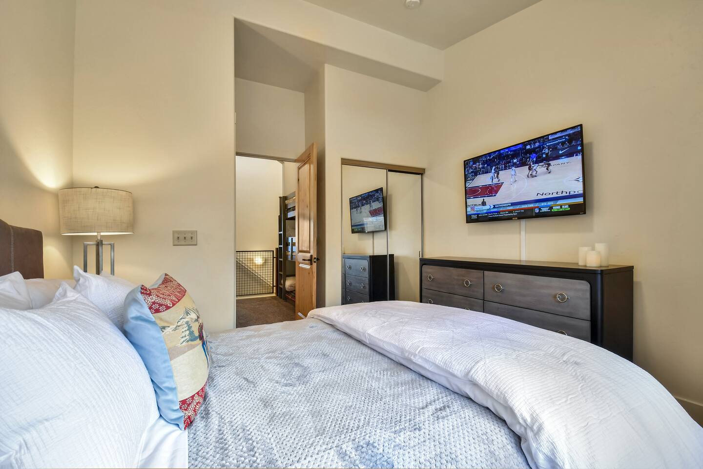 Comfort Meets Luxury: Recently acquired and elegantly furnished, our spacious townhome accommodates up to 7 guests. Need more room? A similar unit (#33) next door is available at a special discount. Tech-Savvy Amenities: From 65" and 55" Smart TVs to a state-of-the-art Sonos soundbar and speakers, we've got your entertainment needs covered. Stay connected with high-speed broadband internet (200Mb) and a variety of premium streaming services. Practical Comforts: Make use of the in-unit hot tub, Weber Grill, boot and glove warmer/dryer, and a fully-equipped kitchen. An attached garage is available, though you'll hardly need a car! THE LAYOUT: Ground Floor: Open-concept living area with a cozy fireplace and floor-to-ceiling windows Fully-equipped kitchen with bar seating Dining area with seating for six Half-bath with a tile shower Upper Level: Master bedroom: King bed, private bath, and deck Second bedroom: Queen bed, private bath, and deck Loft: Triple bunk bed Laundry: Stackable washer/dryer Central A/C
