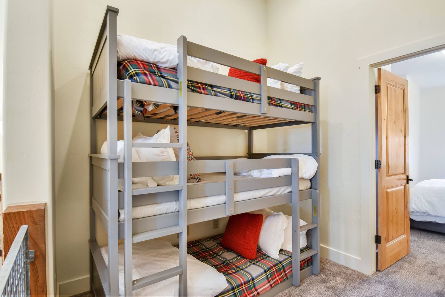The bunk room is a converted loft, ideal for families and close friends. However, for three adult couples, there may be more suitable layouts.